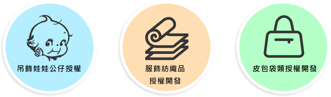化妝品、嬰兒食品、 奶瓶、嬰兒車、奶瓶加熱器、小飾品、音樂盒、玩具、濕紙巾、嬰兒搖床、杯、皮包、耳溫槍、金屬製品、 手工用具、手機吊飾、 毛巾、 服裝、手機及電腦圖像下載等等系列授權。
